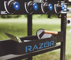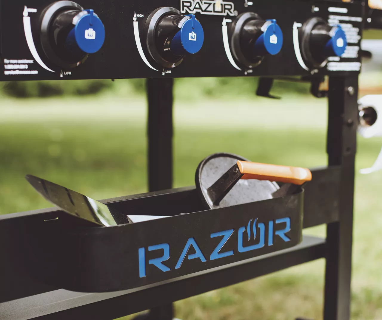 Cook up to 53 burgers at a time, fry up some eggs, sizzle some bacon or even do stir fry all with the versatile Razo super-sized griddle grill. Perfect for camping, tailgating or your backyard, the Razor features four stainless steel burners for a total of 53,000 BTUs of power. A push and turn ignition makes this grill easy to light and simple to use. Clean up is a snap and no spills with the unique grease management system and concealed cup. Ultra handy shelves fold and double as a fitted lid that locks, protecting the cooking surface. The wheels and compact design make transporting easy for your next event.