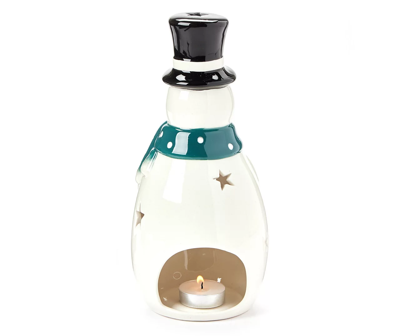This candle holder adds a whimsical winter touch to your home! The ceramic snowflake is bundled up in his classic top hat, a scarf and mittens as star and snowflake cut-outs allow you to view the glow of the tealight candle you place in the opening. This candle holder is a charming Christmas addition to a mantel, table or shelf.