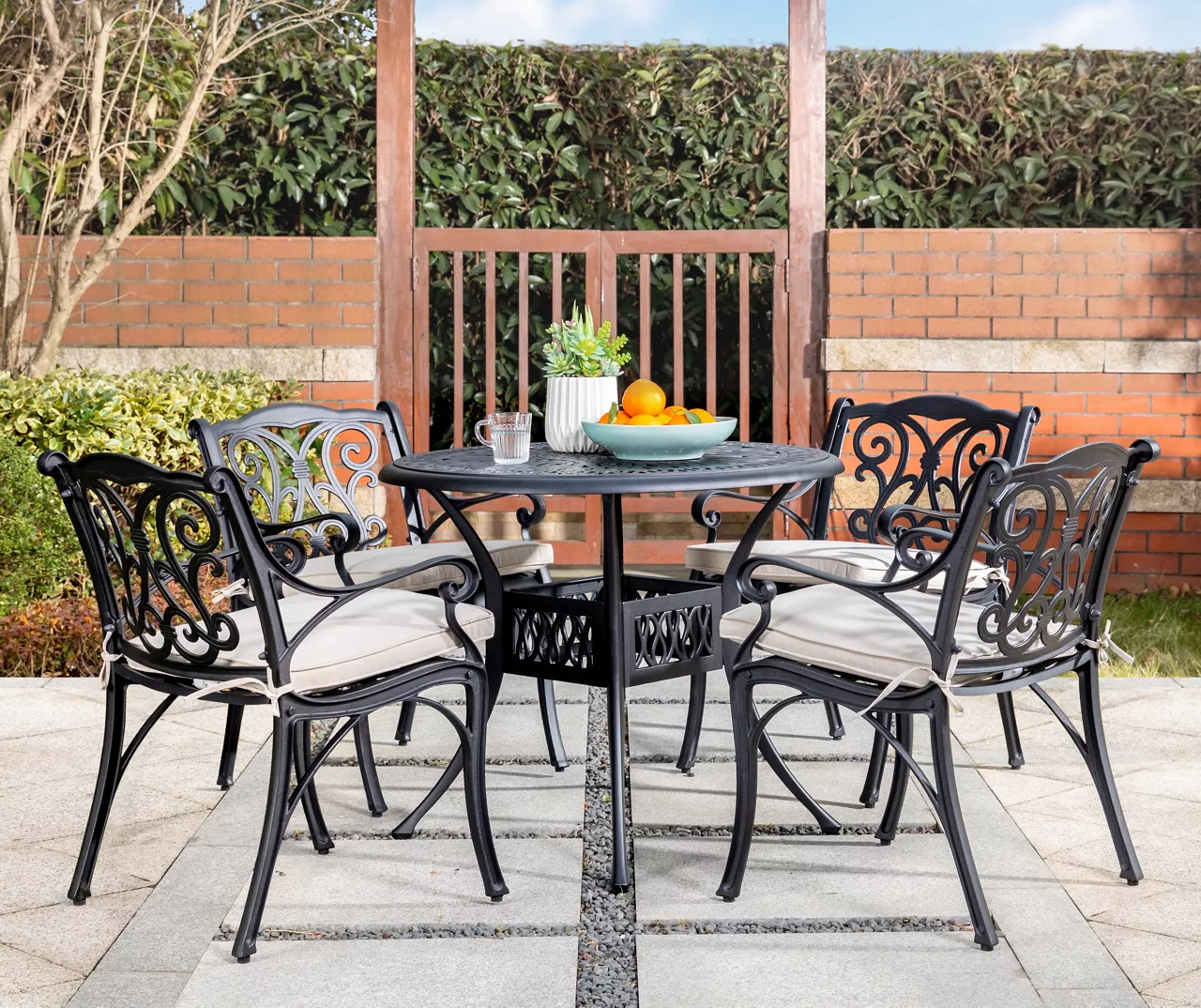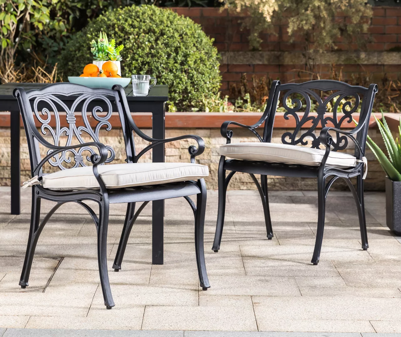 - Includes 2 outdoor dining chairs with cushions