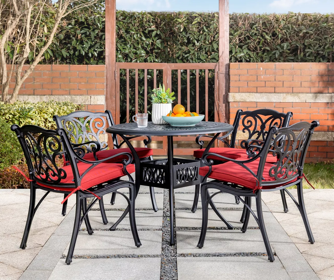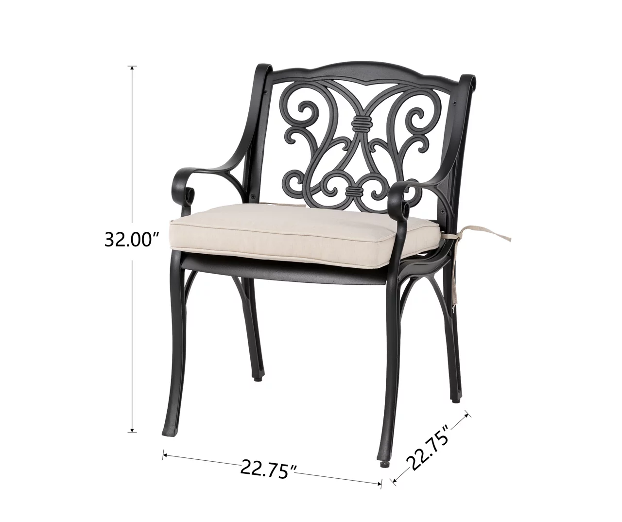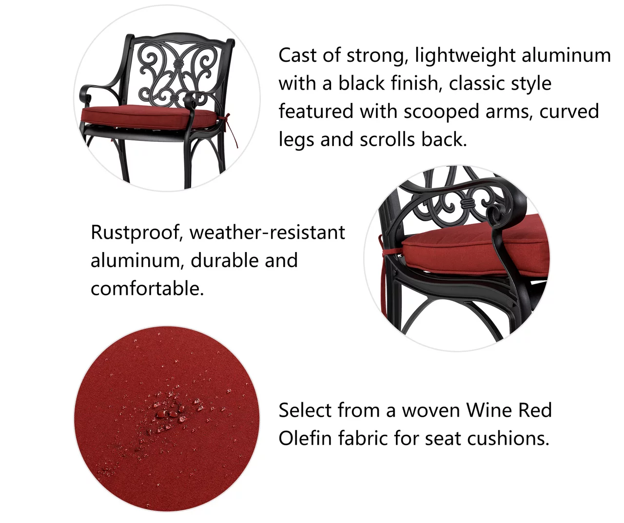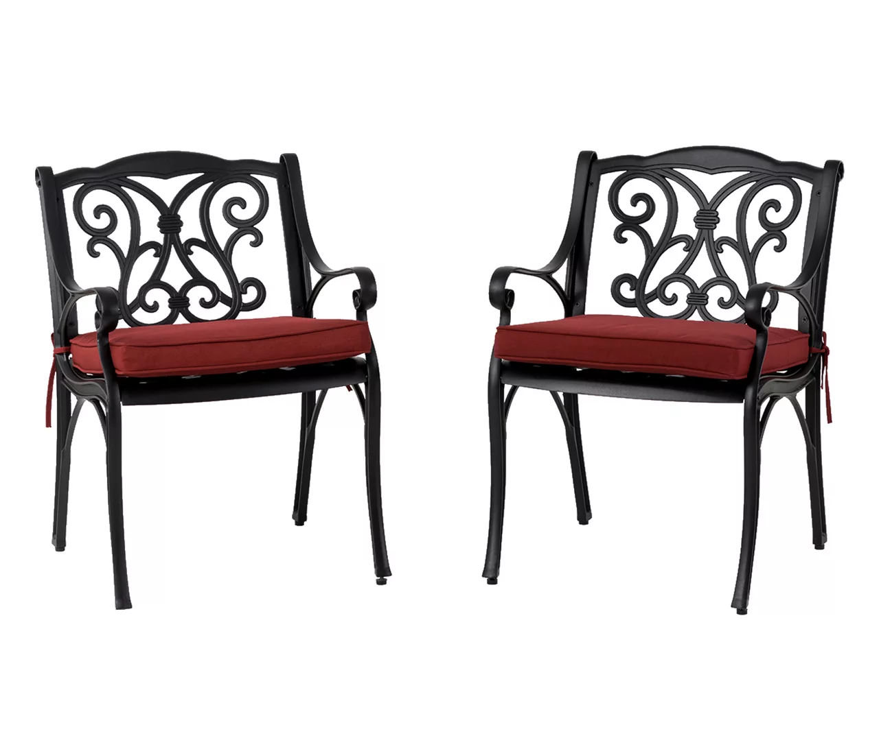 The two-piece chair set is a beautiful addition to your garden, patio, or deck. Crafted from cast aluminum, each piece showcases a powder-coated black finish that prevents wear from weather and UV rays without any maintenance. Olefin wine red cushions are included for each seat, ensuring that your family and guests stay comfortable throughout the meal. This set features an open metal weave motif with a beautiful scroll design that highlights its elegant hand-crafted details.