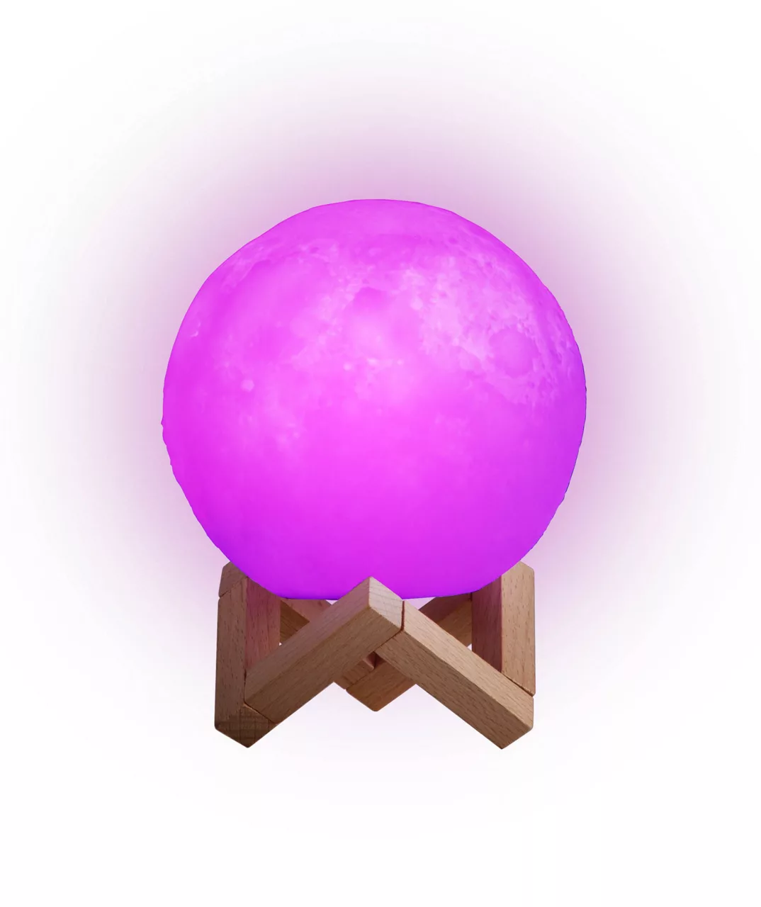 Bring the light side of the moon to your space with this unique table lamp. It features a realistic 3D moon design that rests on a geometric wooden stand. Use the included remote to choose from 16 LED colors, along with brightness and light mode settings.