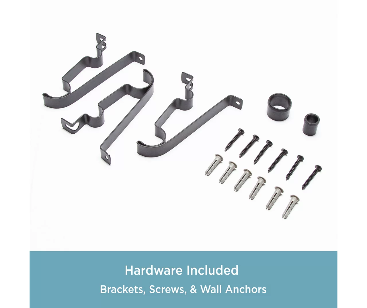 - Includes 1 telescoping double curtain rod with finials, 2 mounting brackets, 1 center support, screws, drywall anchors and installation instructions