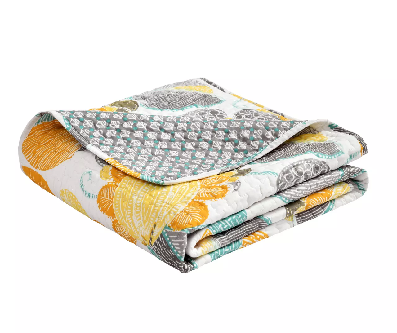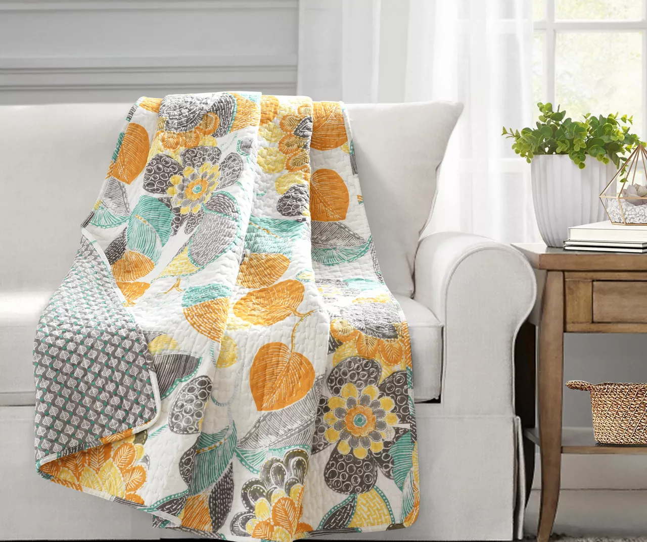Get cozy on cool days and chilly evenings with the quilted warmth of this cotton throw that adds colorful boho elegance to your space through a patterned floral print on the front and dotted leaf pattern on the reverse side.