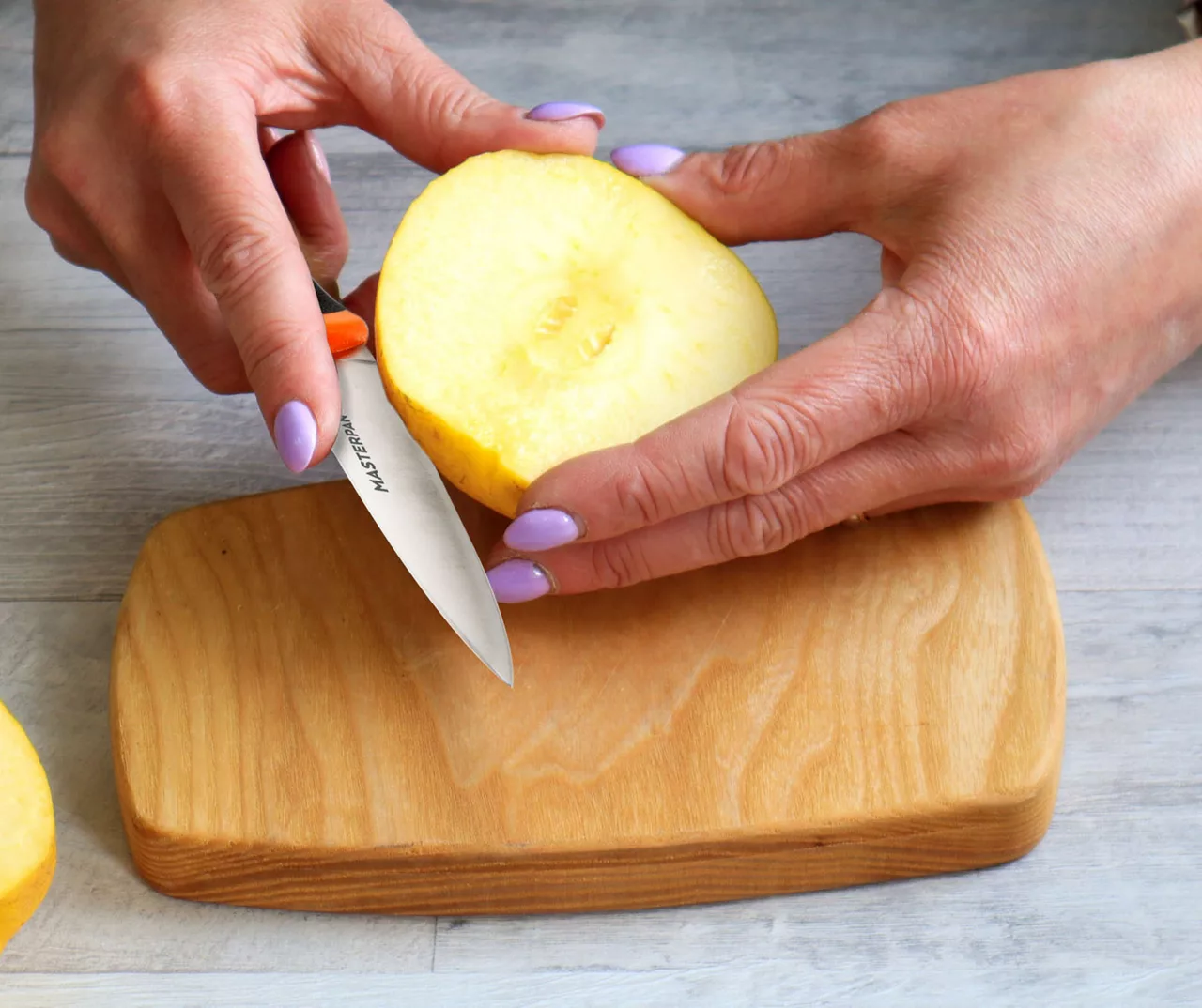 This beautiful knife set from Masterpan offers everything you need to fulfill your daily kitchen prep needs. All the knives are made with a single piece of high carbon stainless steel with an ergonomic TPR material non-slip handle for long lasting reliability.