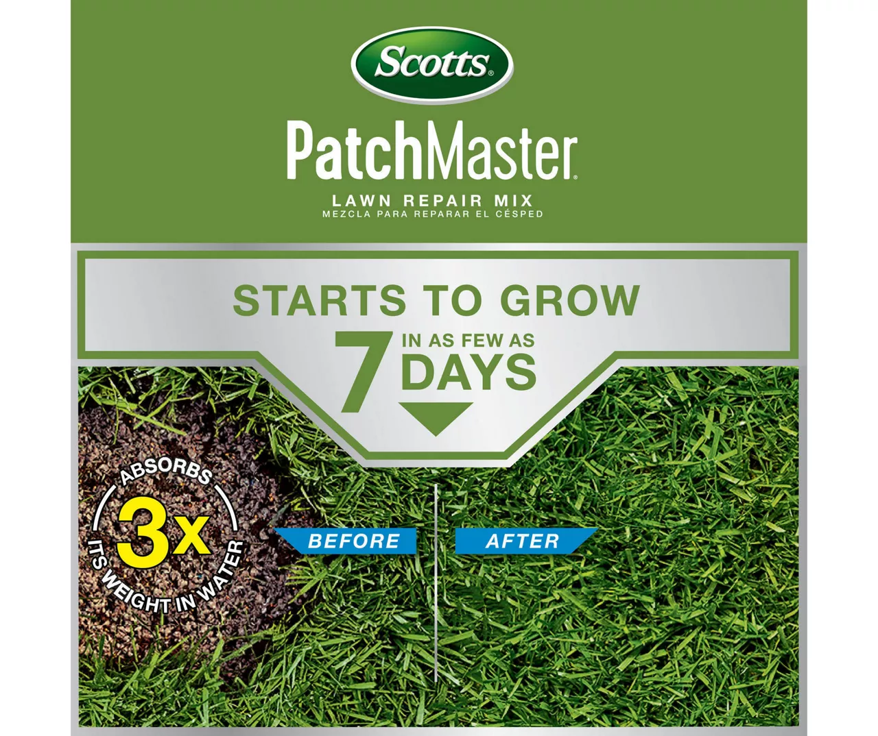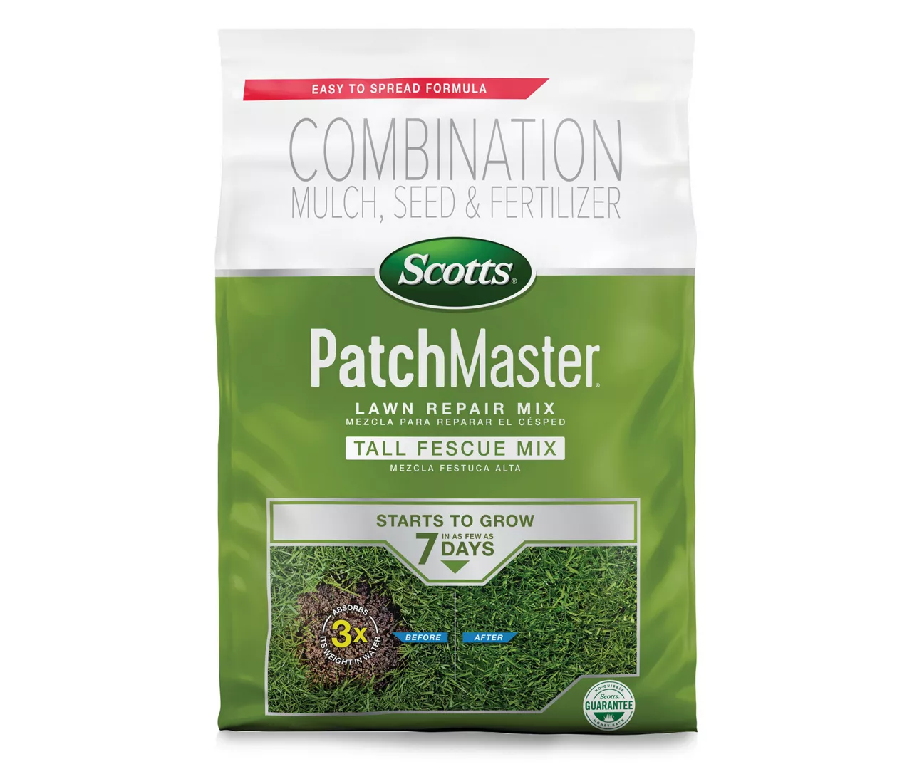 Improved Scotts PatchMaster Lawn and Tall Fescue Mix has everything you need to repair bare spots in your lawn. It includes seed, 100% recycled mulch to keep the seed moist during establishment and fertilizer to help feed seedlings for up to 6 weeks for fast growth and thick results.