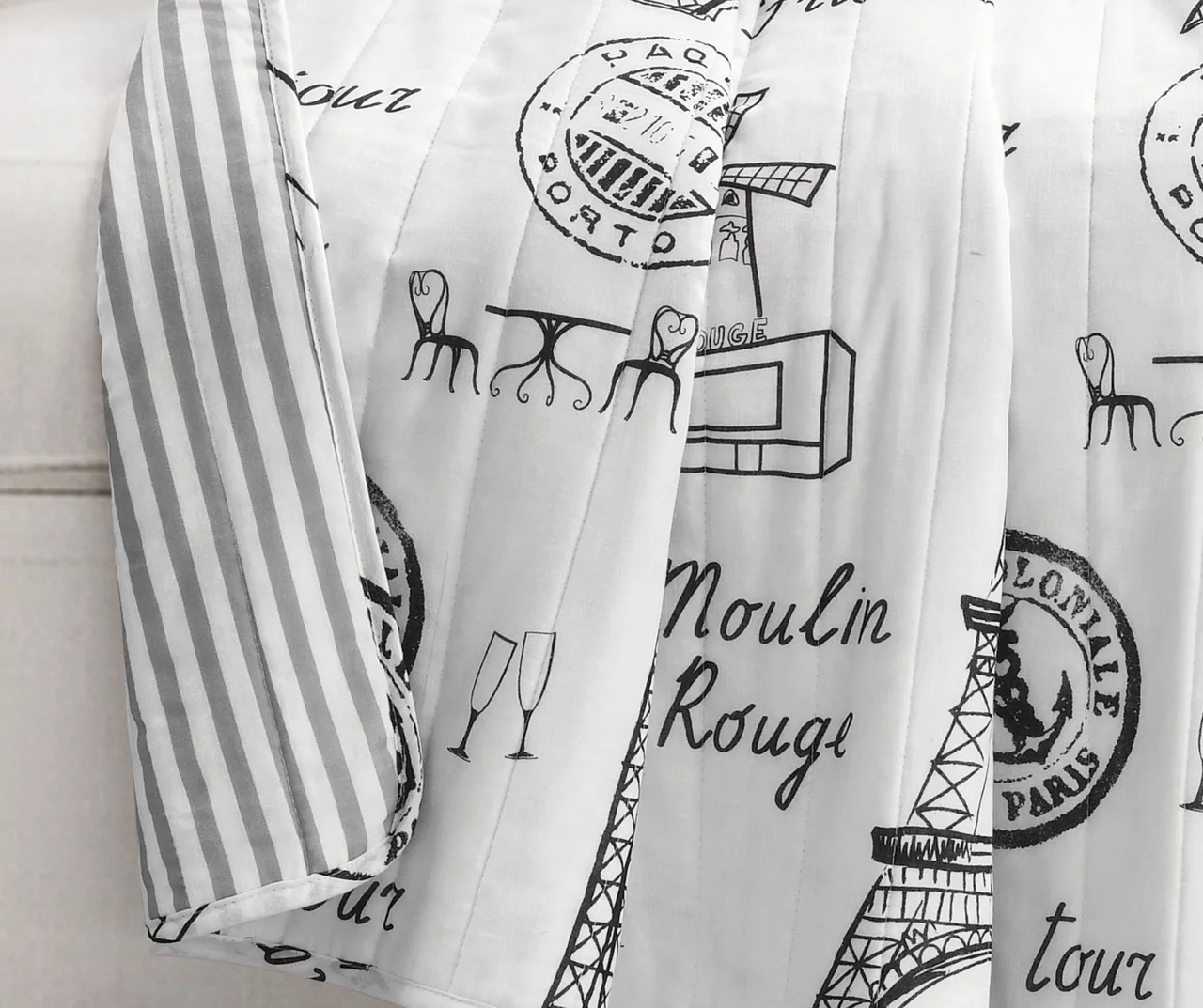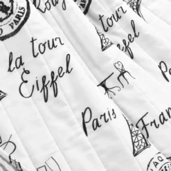 Parisian elegance defines this quilted throw with an Eiffel tower pattern accented by champagne glasses and script typography. Breathable cotton fabric makes for a comfy and cozy layer on cool days and evenings.