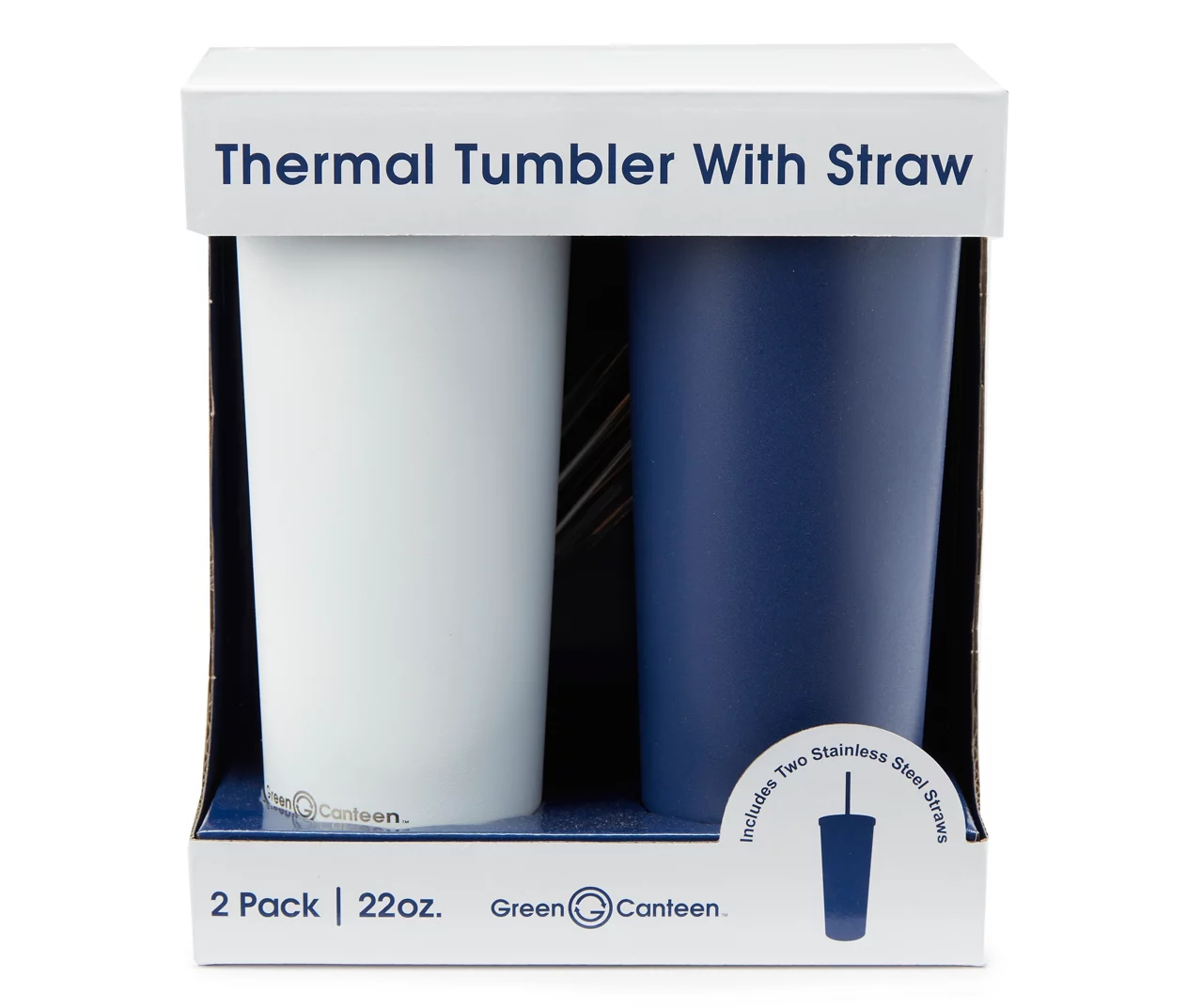 - Includes 2 – 22 oz. stainless steel tumblers, 2 – lids and 2 – stainless steel straws